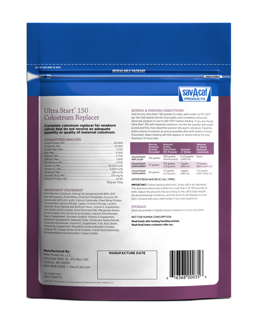 MIXING DIRECTIONS - CALVES Measure or weigh 350 grams (2 level-full scoops) of Ultra Start® 150 Colostrum Replacer powder. Add powder to 1-1/2 quarts of warm water at 110-120°F and mix thoroughly until completely dissolved. Allow the solution to cool to 100-105°F before feeding.
